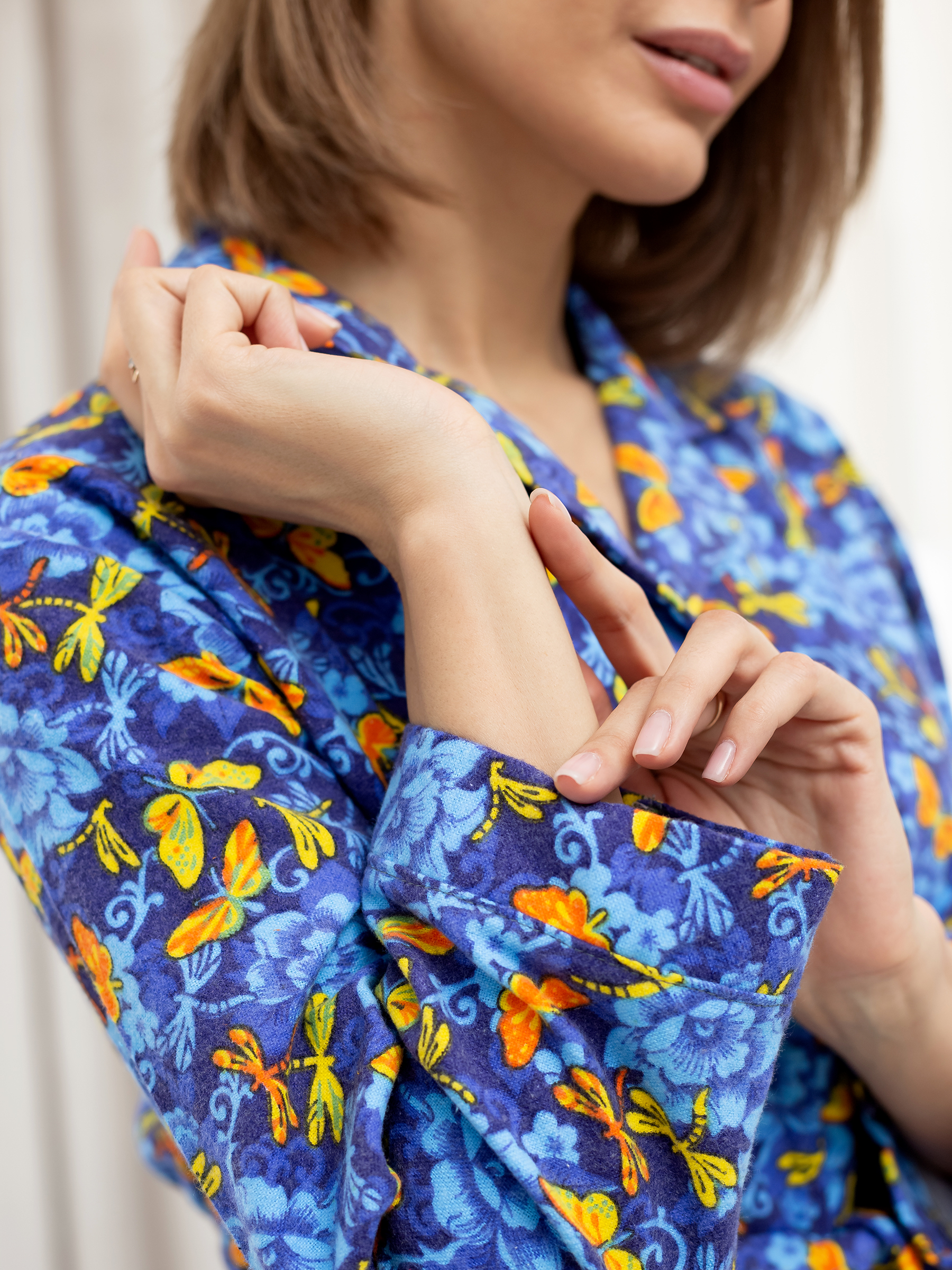 Халат байковый женский с длинным рукавом и накладными карманами на пуговицах.