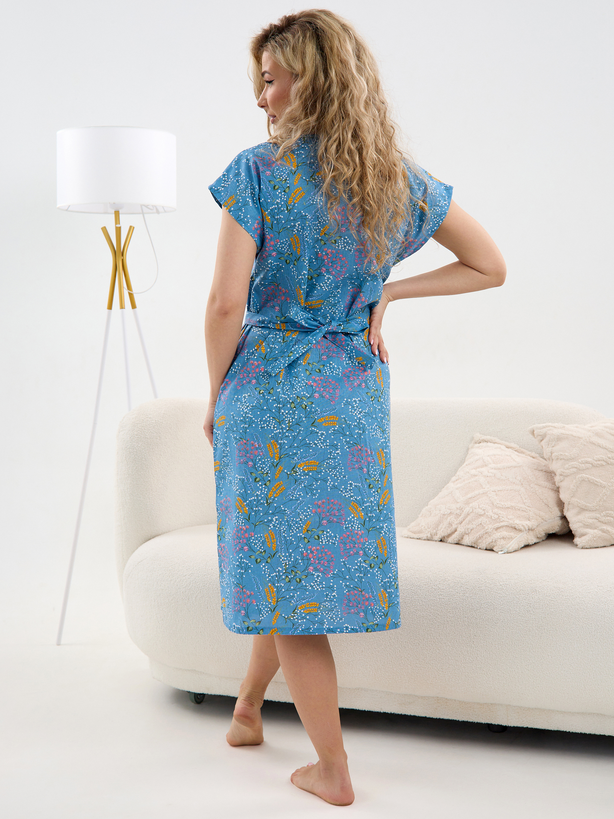 Халат домашний бязевый от компании Лето-Текс, выполнен из натурального хлопчатобумажного материала из бязи - 100% хлопок. Ткань бязь изначально жесткая, после стирки становится мягче. Халат женский на запах с накладными карманами и спущенным плечом. Халат запашной ниже колена, рост модели на фото 165 см., а ростовка халата 170см. Достоинствами такого халата для дома являются его экологичность и безопасность, он не вызывает аллергии, кожа в нем дышит, а влага впитывается. Домашний халатик отлично подойдет для дома, надеть с утра или после ванны, не сковывает движений и отлично сидит по фигуре и подчеркивает талию. Халат летний женский длинный с коротким рукавом подойдет для беременных роддома, для кормления грудью, для кормящих мам. Халат больших размеров хороший подарок на день рождения 8 марта для мамы и бабушки. Халат рабочий отличный вариант для дачи и в качестве униформы. Халат хлопок на запах женский отлично подойдет в качестве домашней одежды для полных женщин.